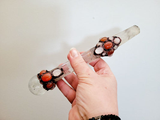 Clear Qtz Crystal Wand with carnelian and rose qtz embelishments
